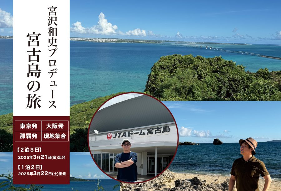 ①JTAドームで行われる「宮古島(ミャ~ク)の夕べ」にて、宮沢さんと地元唄者さんによるスペシャルトーク&ライブ&クイチャー※の観覧※会場前方にツアー参加者様用イス席確保(1泊2日/2泊3日)