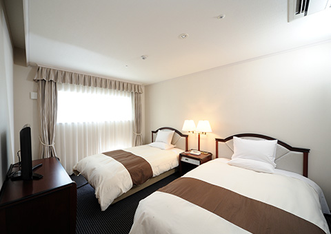 ツインルームには全室、優雅なシャワーブースを設置。シックな内装と広々とした客室でゆとりのホテルライフをお約束いたします。