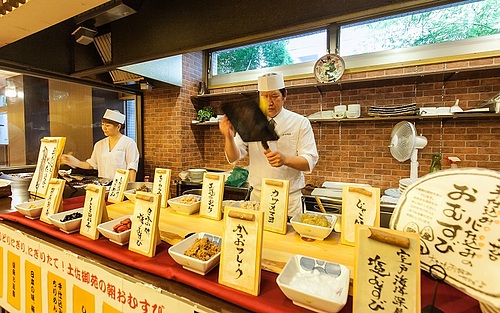 朝食四国一宣言!大好評朝食おむすびを始め肉・魚料理も充実した日替わり和洋バイキングをお楽しみください。